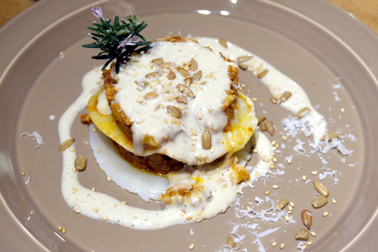 Tallar la pasta fresca amb anella metàl·lica. Bullir-la amb abundant aigua i sal durant tres minuts. Un cop cuita refredar amb aigua i gel per tallar la cocció. Muntar al motlle amb diferents capes alternant pasta i carn picada. Escalfar al forn o al microones, treure el motlle, afegir la beixamel i els fruits secs.