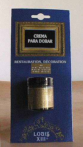 DESCRIPCION Y CARACTERISTICAS: La CREMA PARA DORAR LOUIS XIII está pensada principalmente para la restauración y decoración de cualquier superficie. Sus tintes poseen la cualidad de poder ser superpuestos o mezclados con lo que se conseguiría el color deseado, llegando incluso a poder ser diluida con trementina. La aplicación puede ser realizada sobre marcos, espejos, entreventanas, molduras, repisas, asientos dorados, maquetas, bibelots... UTILIZACION: Se emplea sobre madera, yeso, staff, estuco, mármol, granito, metal (bronce, cobre...), cuero, tela, cartón... MODO DE EMPLEO: Para un mejor resultado, les recomendamos aplicar con el dedo la CREMA PARA DORAR LOUIS XIII sobre las partes planas, y sobre las zonas con relieves, con la ayuda de un cepillo pequeño y suave. Dejar secar por completo y lustrar. Si deseara un mejor resultado final, le sugerimos que lustren el objeto con un cepillo de seda, con lo que usted conseguirá un aspecto más brillante.