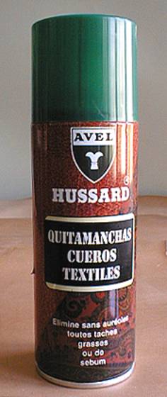 DESCRIPCION Y CARACTERISTICAS: Este producto elimina sin dejar aureola todas las manchas grasas (aceite, grasa, mantequilla, salsas grasas, sebum...) o suciedades grasas, igualmente viejas (zona del cuello y de los puños en las ropas de cuero y en los lugares donde reposa la cabeza).Este artículo es actualmente el único producto eficaz en el mercado. Aconsejamos para quedar personalmente convencido de la eficacia del producto, verter aceite sobre un trozo de cuero y dejarlo penetrar, después de un período de tiempo aplicar el QUITAMANCHAS HUSSARD AEROSOL. El resultado será sorpren-dente.UTILIZACION: Se emplea sobre todas las prendas de vestir, corbatas, calzados, muebles de cuero, equipajes, interior de coches. Conviene para todo tipo de cuero: liso, con pelo, ante, nubuck... a excepción de los charoles. Util para los tejidos: seda, lana, algodón, poliéster... a excepción de la popelina y los tejidos impermeabilizados o recauchutados.MODO DE EMPLEO: Actuar