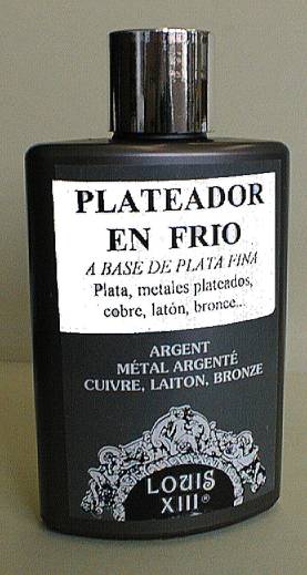 DESCRIPCION Y CARACTERISTICAS: EL PLATEADOR EN FRIO LXIII, renueva la orfebrería depositando una fina capa de plata sobre el metales. Todo metal una vez tratado puede ser utilizado para el contacto con alimentos. Indicado igualmente para los aliados del cobre. UTILIZACION: Se emplea sobre la plata, metales plateados, cobre, latón, bronce... MODO DE EMPLEO: Limpiar la superficie a platear con la ayuda de un producto apropiado. Desengrasar con agua caliente jabonosa. Agitar. Aplicar el PLATEADOR EN FRIO LXIII con la ayuda de un algodón empapado de producto. Pasado un instante, enjuagar con agua caliente jabonosa. Repetir la operación si fuese necesario. CONSEJOS: Para mantener por más tiempo sus metales brillantes y relucientes, les recomendamos aplicar a continuación el BARNIZ CRISTAL LXIII.